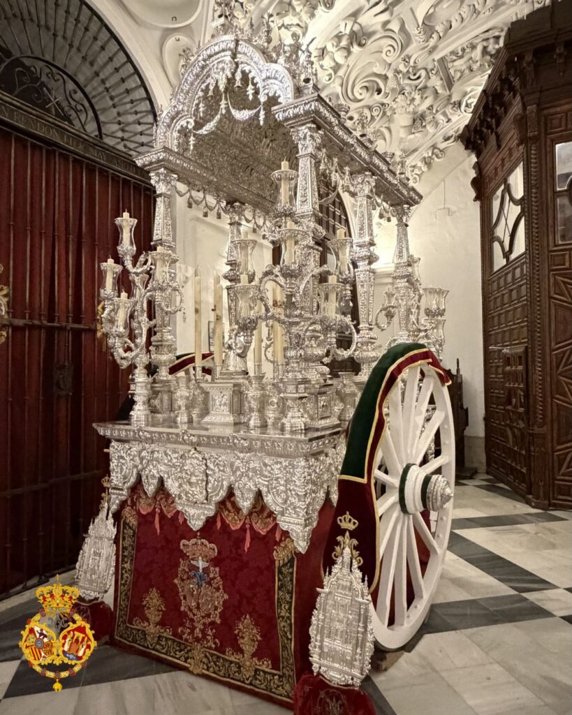 La carreta del Simpecado luce en la iglesia los Terceros antes de la procesión