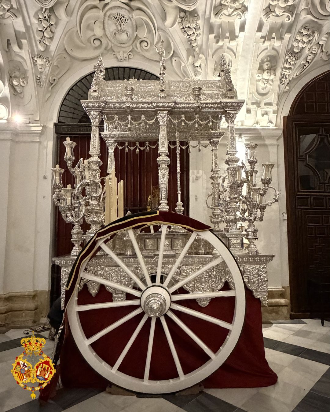 Así luce la carreta de Nuestro Bendito Simpecado, tras las labores de priostía mantenidas en la tarde y noche de ayer.