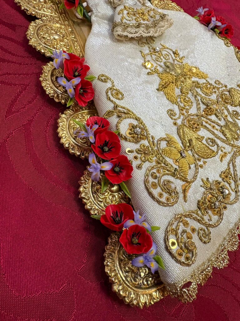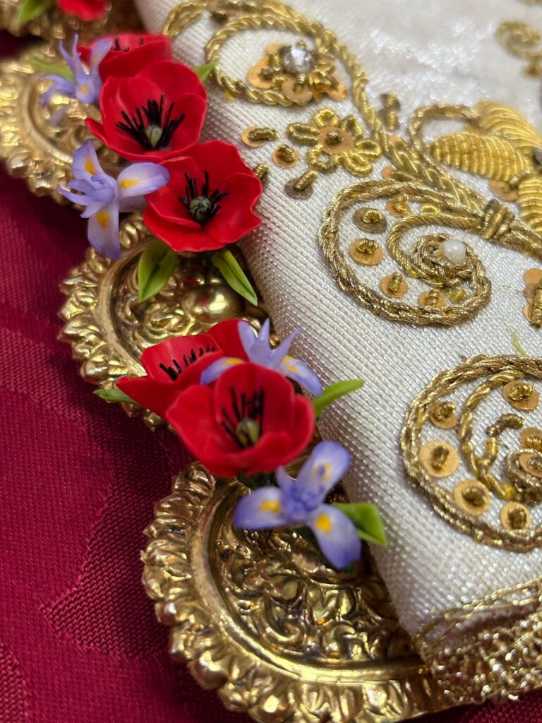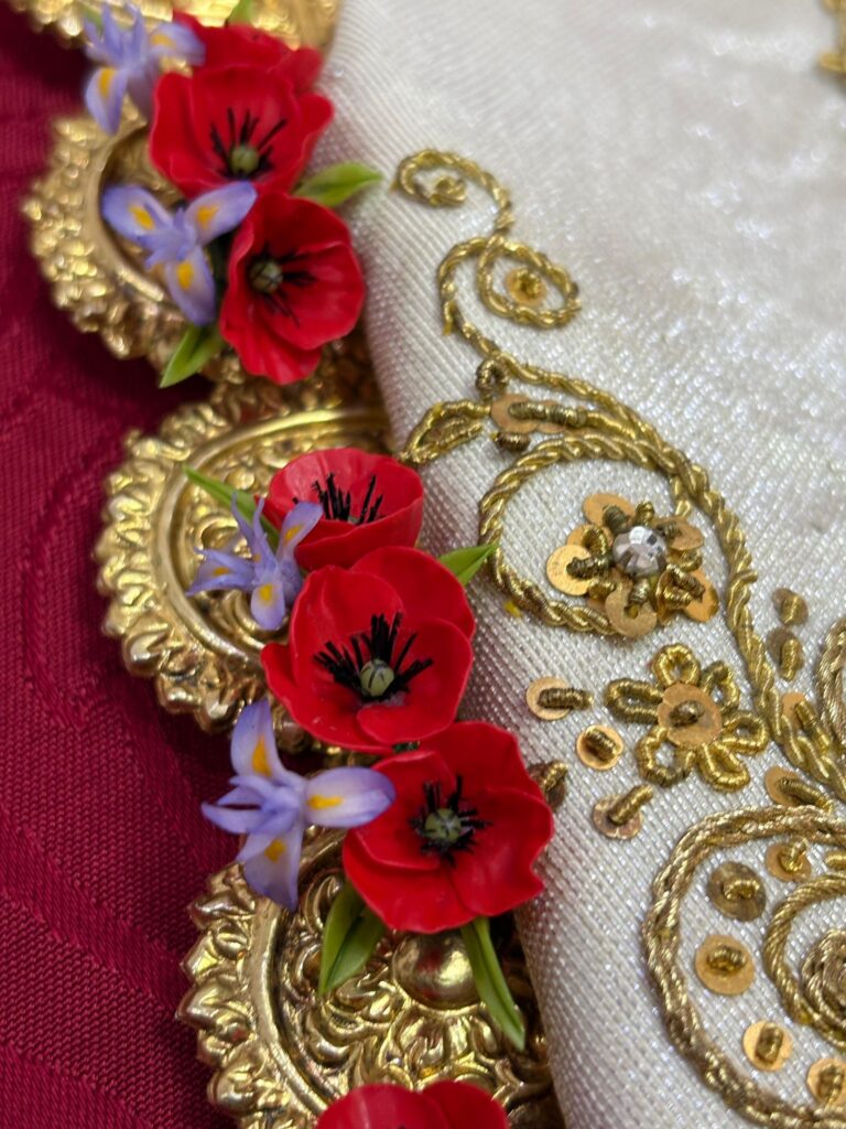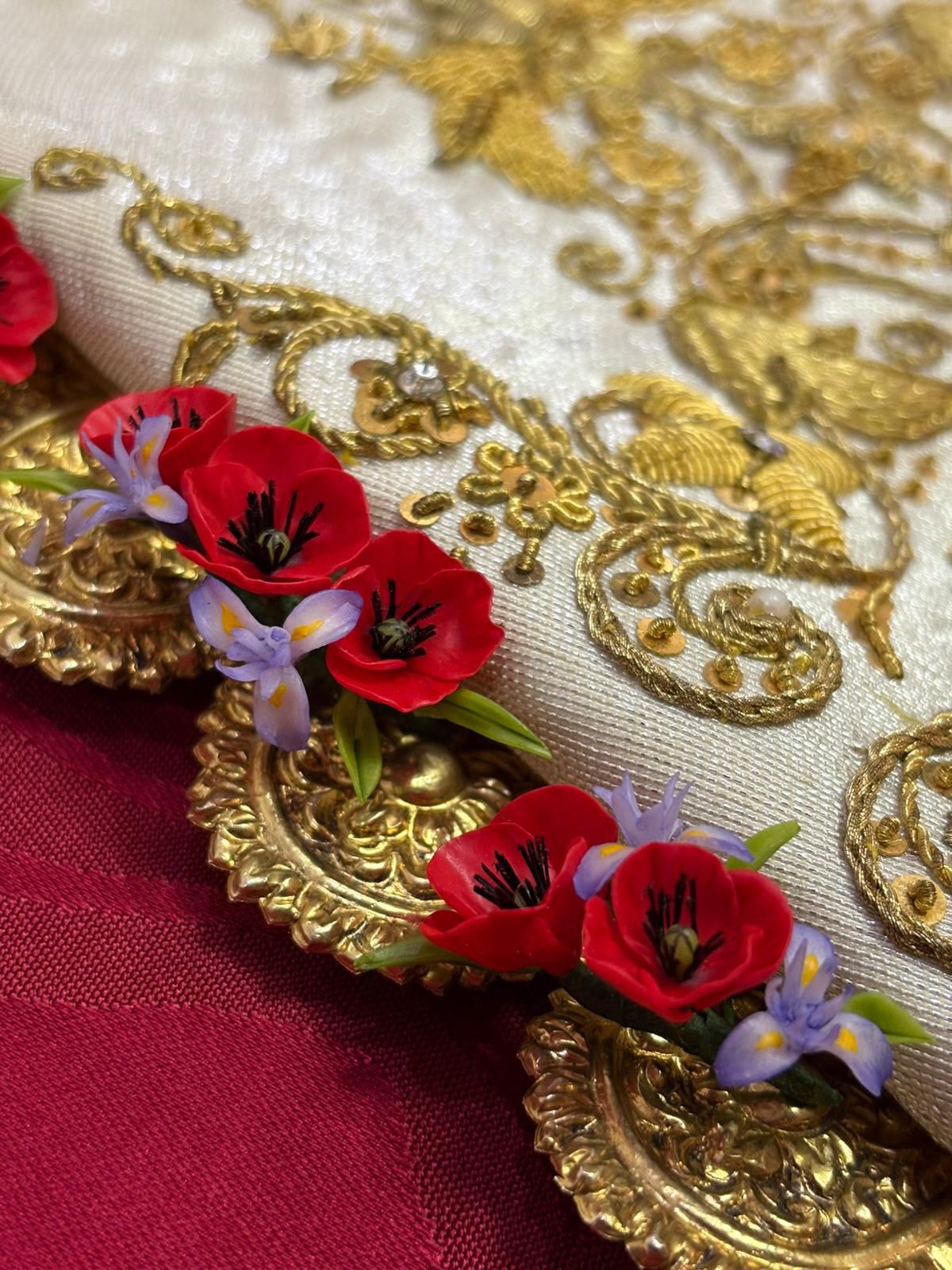 Las piezas, que representan amapolas y lirios, destacan por su delicadeza y por la profunda carga simbólica que evocan, convirtiéndose en un detalle lleno de arte y devoción.