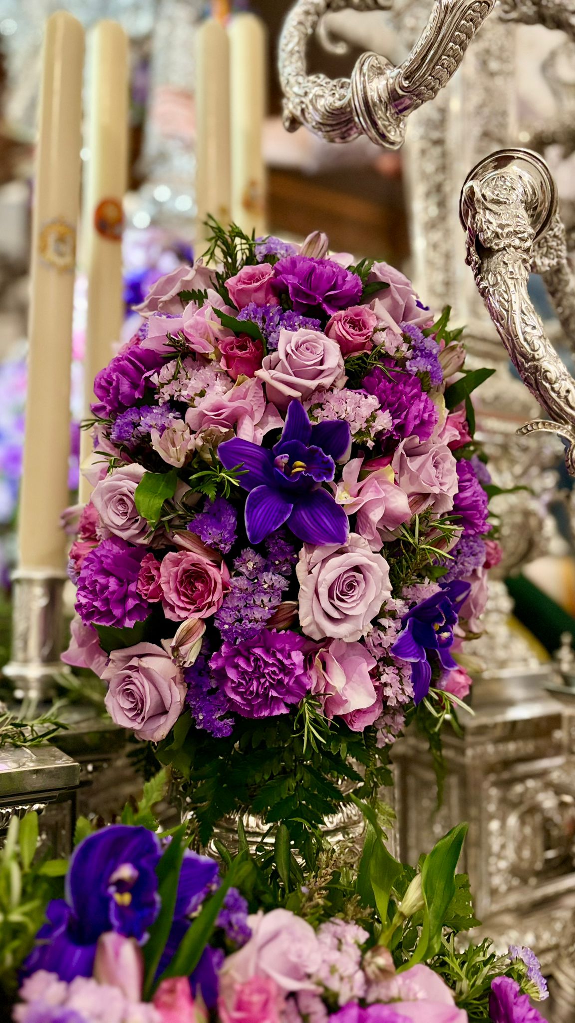El conjunto está integrado por orquídeas Cymbidium, que aportan distinción y sobriedad; rosas Ocean Song y rosas spray, expresión de delicadeza y armonía; clavel fancy, fiel reflejo de la tradición; astromelias, símbolo de devoción; statis, evocador de permanencia; y romero.