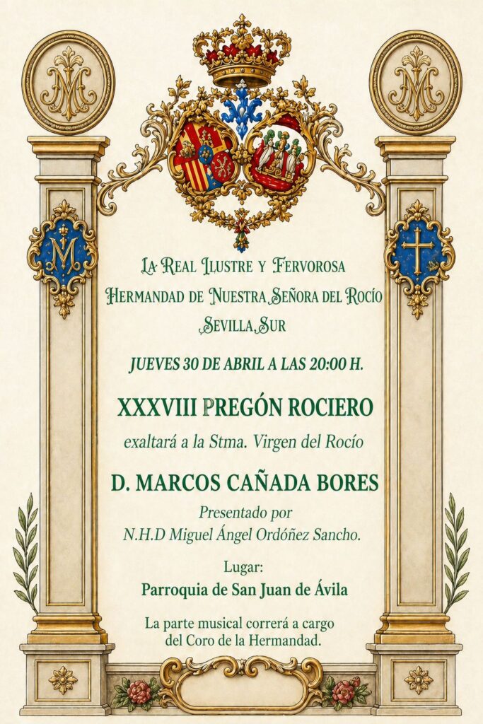 El próximo jueves 30 de abril a las 20:00 horas, tendrá lugar el XXXVIII PREGÓN ROCIERO de Nuestra Hermandad. Dicho pregón estará a cargo de