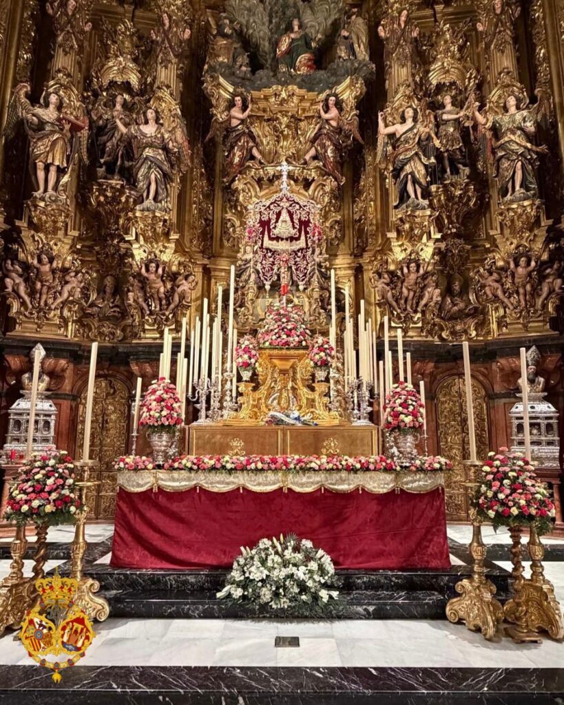 Así luce nuestro Bendito Simpecado en el altar dispuesto en la Iglesia Colegial del Divino Salvador con motivo del Pregón de las Glorias de Sevilla