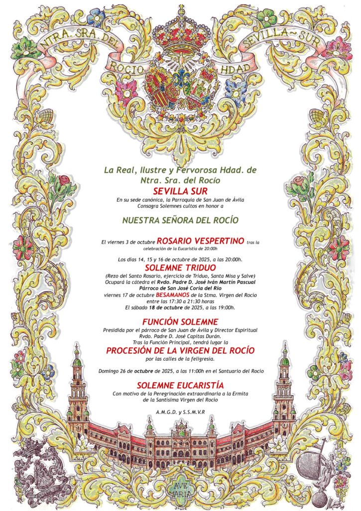 Se comunica a los hermanos que, en cumplimiento de lo preceptuado en nuestras Reglas y tras la celebración de Cabildo de Oficiales el pasado 14 de julio, la Hermandad de Nuestra Señora del Rocío de Sevilla Sur celebrará Cabildo General de Elecciones (D. m.) el próximo viernes, 17 de octubre de 2025, en los Salones